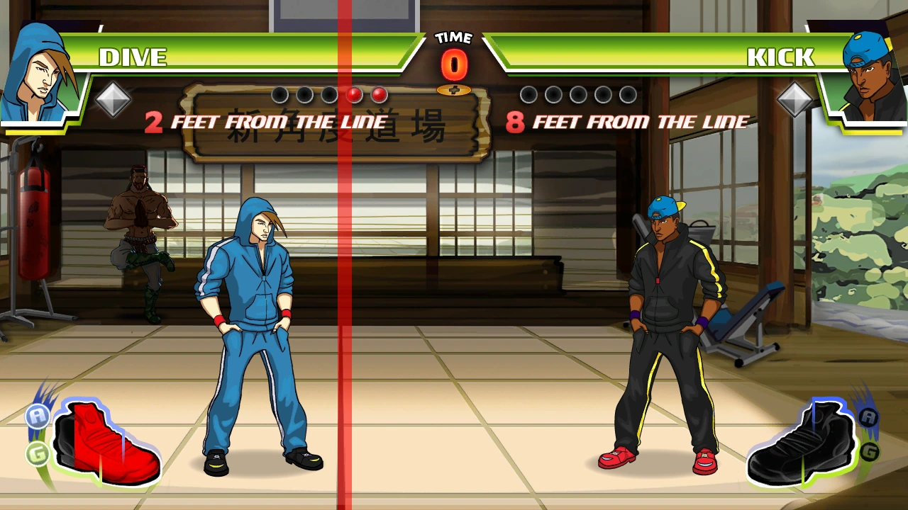 In case of a draw (both players end at the same distance from the line) the God of Divekicking will stomp over both players, both of them losing the round.