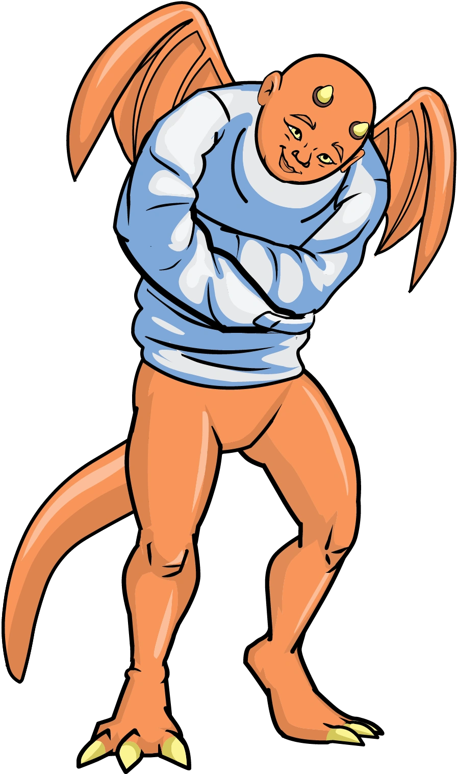 Steam has two troll wings, along with a tail, His skin color is orange and he appears to be in a straitjacket.